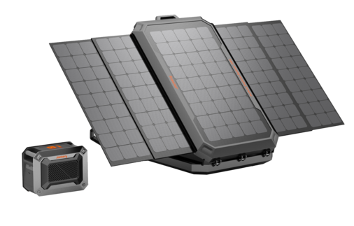 Jackery stellt auch eine mobile Speicherlösung vor. Sie lässt sich bei Bedarf einfach in einen Heimspeicher umwandeln. Das Paket besteht aus der Powerstation 2000 Plus, einem Akkupack, zwei Solarpaneelen mit je 200 Watt Leistung und einem Wechselrichter. Ein sogenannter Transferschalter mit intelligentem Managementsystem schließt die Lücke zwischen der Stromversorgung unterwegs und dem stationären Strombedarf zu Hause.