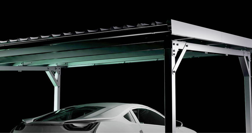 Auch S-Flex aus Hamburg setzt auf feuerverzinkten und pulverbeschichteten Stahl. Der Hersteller von Montagesystemen hat auf der Intersolar ein eigenes Caportsystem vorgestellt. Durch die Verwendung von Z-Profilen als Pfetten können die einzelnen Segmente des Carports zu längeren Reihen modular verbunden werden.