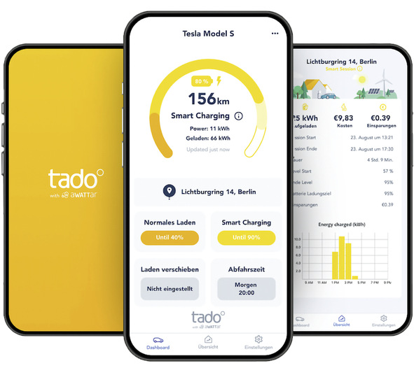 Das Unternehmen Tado bietet intelligentes Laden (Smart Charging) für E-Autos an der heimischen Ladestation. Die App nutzt die volatilen Preise an der Strombörse und plant den Ladevorgang zu Hause automatisch in Zeiten mit niedrigen Energiepreisen – ganz gleich, wann das E-Auto an die Wallbox angeschlossen wird. Haushalte können so durchschnittlich 30 Prozent der jährlichen Ladekosten für Elektrofahrzeuge einsparen und gleichzeitig den Ökostromanteil maximieren.