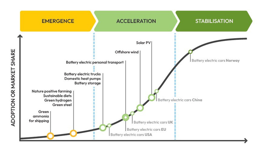 Eine andere Perspektive setzt der aktuelle Global Tipping Points Report 2025, verfasst von Forschenden der University of Exeter, in Zusammenarbeit mit Wissenschaftlerinnen und Wissenschaftlern weltweit. Demnach gibt es nicht nur Ereignisse, die einen negativen Einfluss auf die Umwelt haben. Fortschritte im Ausbau von klimafreundlichen Technologien und die damit verbundene Stabilisierung des CO₂‑Ausstoßes ergeben genauso gut positive Kipppunkte. Die Technologien werden dabei danach unterteilt, ob sie aktuell erst am Aufkommen sind, schon im Ausbau sich befinden, oder in einem Wirtschaftsbereich bereits Stabilisierung erreicht haben. Grüner Wasserstoff oder grüner Stahl befinden sich somit noch in der ersten Phase und der Ausbau von vielen erneuerbaren Energien oder Batteriespeichern ist im Aufschwung. Den erfolgreichen Kipppunkt zur Stabilisierung hat bereits die Mobilität in Norwegen erreicht. Im Jahr 2024 waren 88,9 Prozent der in Norwegen verkauften Neuwagen Elektrofahrzeuge.