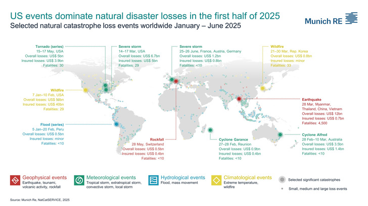 Weltweit haben Naturkatastrophen im 1. Halbjahr dieses Jahres Gesamtschäden von etwa 131 Milliarden US-Dollar verursacht. Damit lagen sie deutlich über den Durchschnittswerten der vergangenen zehn und 30 Jahre, die inflationsbereinigt 101 und 79 Milliarden US-Dollar betrugen. Das meldet die Versicherung Munich Re.