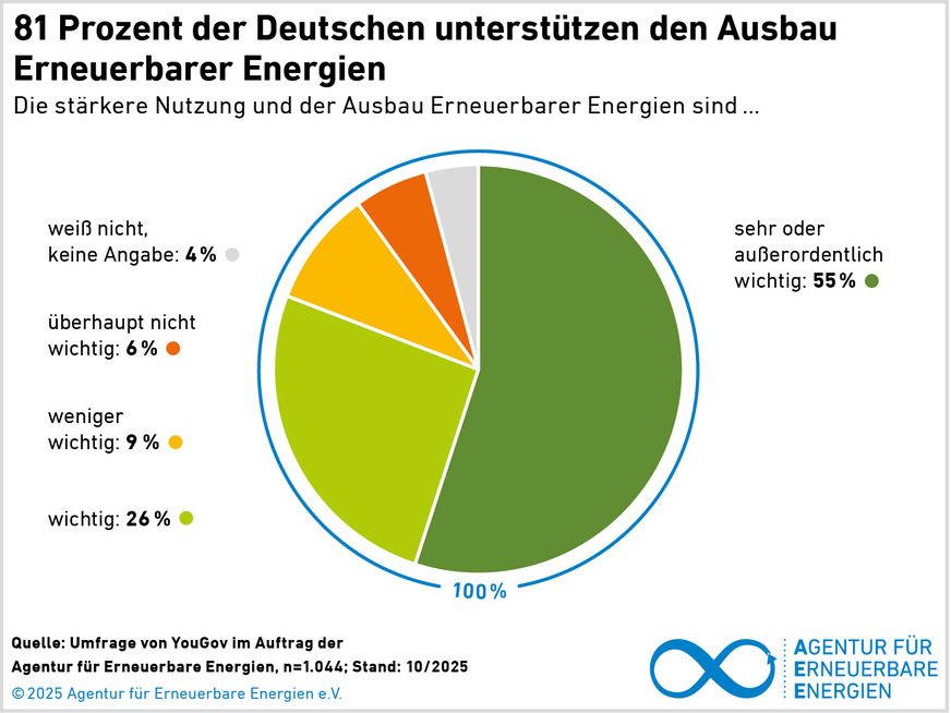 81 Prozent der Deutschen befürworten den Ausbau Erneuerbarer Energien – ein Beweis dafür, dass die Energiewende in breiten Bevölkerungsschichten verankert ist. Dies zeigt die aktuelle Akzeptanzumfrage von Yougov im Auftrag der Agentur für Erneuerbare Energien (AEE). Gegenüber dem Vorjahr konnte das hohe Zustimmungsniveau sogar leicht gesteigert werden, und auch die Sichtbarkeit der Energiewende nimmt zu: Immer mehr Menschen leben in der Nähe von Solar-, Biogas- oder Windenergieanlagen. Während Klimaschutz und Versorgungssicherheit zentrale Treiber bleiben, ist der entscheidende Faktor für anhaltende Zustimmung das persönliche Erleben: Wer erneuerbare Anlagen vor Ort kennt, bewertet sie überdurchschnittlich positiv.