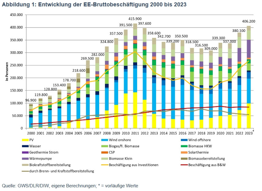 Aufgeschlüsselt nach Technologien ergab sich ein differenziertes Bild. So ist der Zuwachs 2023 vor allem der Photovoltaik zu verdanken – auch wenn sie noch lange nicht den Höchststand von 2011 erreicht hat. Trotz hoher Importquoten habe der enorme Anstieg der Nachfrage zu einer um 35 Prozent gestiegenen Beschäftigung gegenüber 2022 geführt, heißt es in dem Papier. Im Bereich Betrieb und Wartung waren 2023 insgesamt 98.600 Menschen beschäftigt.