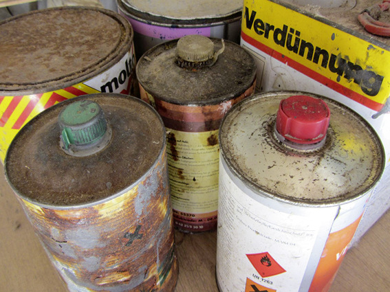 Flüssigkeiten wie Farben, Imprägniermittel, Laugen, Lösemittel, Säuren, Schmierstoffe oder Säuren können den Boden, das Grundwasser und die Luft verseuchen. Sie dürfen deshalb nicht über die Restmülltonne oder das Abwasser entsorgt werden. Diese Problemstoffe müssen in speziellen Behältern gelagert und über gewerbliche Entsorger beseitigt werden. Bohr-, Säge-, Schleif- oder Schneidöle lassen sich wiederaufbereiten.