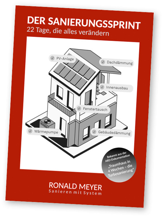 In Kürze erscheint das Buch „Der Sanierungssprint – 22 Tage, die alles verändern“. Autor Ronald Meyer beschreibt darin den Sanierungssprint in allen Details vom ersten Gebäudecheck bis zur Einweihungsfeier. Die ersten 180 Seiten können bereits als kostenlose Leseprobe unter https://bauingenieur-meyer.de/ angefordert werden.