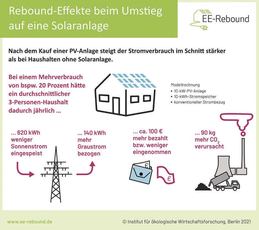 Die Ergebnisse sollten nicht so interpretiert werden, dass der Umstieg auf erneuerbare Energien nicht notwendig ist. Wenn ein Haushalt auf Photovoltaik umsteigt und dann 5 % mehr Strom verbraucht, ist das immer noch besser, als wenn er nicht umgestiegen wäre. Es geht also nicht darum zu sagen, der Umstieg ist falsch oder überflüssig, weil er zu Mehrverbrauch führt. Da wir aber insgesamt im Energiesystem mehr Effizienz und Suffizienz benötigen, sind alle Faktoren, die Mehrverbrauch fördern, ein Problem. Rebound-Effekte beim Umstieg auf erneuerbare Energien sind nicht das zentrale Problem. Sie sind aber durchaus eine zusätzliche Herausforderung, wenn wir von einem zukünftigen Energiesystem ausgehen, in dem wir weniger Energie verbrauchen wollen beziehungsweise müssen.