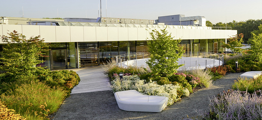 Das Objekt umfasst insgesamt zirka 3870 m² Dachfläche auf verschiedenen Ebenen, davon wurde mehr als die Hälfte begrünt. Die Begrünung ist sowohl als extensive Dachbegrünung in mehrschichtiger Bauweise mit vier Zentimetern Drainage, Filtervlies und elf Zentimetern Extensivsubstrat als auch in Form einer Intensivbegrünung (Dachgarten) auf den niedrigeren Terrassen und dem Aufenthaltsbereich der Mensa ausgebildet. Der begehbare Dachgarten hat einen mehrschichtigen Aufbau. Die Pflanzenauswahl umfasst Stauden, Gräser und Gehölze.