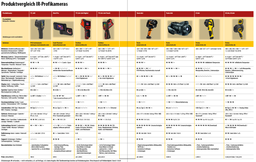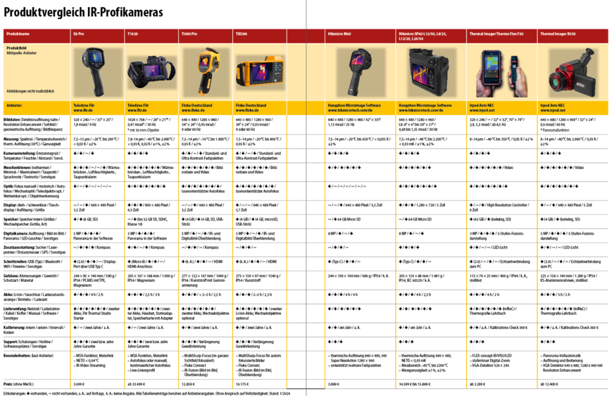 Namhafte Anbieter wie Fluke, Teledyne Flir oder Testo führen gleich mehrere Modelle aus der mittleren und oberen Leistungsklasse im Programm. Deshalb sollte man vor der Auswahl sorgfältig überlegen, wie leistungsfähig die Kamera im Hinblick auf den jeweiligen Einsatzzweck sein soll. Dazu bietet unser tabellarischer Produktvergleich mit nachfolgenden technischen Kriterien ausgewählter IR-Kameras eine erste Orientierung. Im Fokus steht die Qualität des Wärmebilds, die neben der Kameraoptik von der geometrischen und thermischen Auflösung des Detektors bestimmt wird.