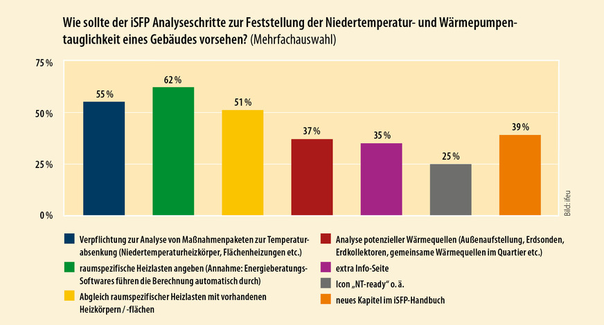 Vor dem Hintergrund der ab 2024 beim Einbau neuer Wärmeerzeuger geltenden 65-Prozent-Regel sowie dem wirtschaftspolitisch beschlossenen Wärmepumpenhochlauf mit dem Ziel, 500 000 Wärmepumpen pro Jahr zu verbauen, wurden die Energieberater:innen zu diesem Thema befragt. 64 Prozent sprechen sich dafür aus, Analyseschritte zu Niedertemperatur- und Wärmepumpentauglichkeit im iSFP fest zu verankern. Zugleich zeichnet sich aber auch die Frage nach dem (zu hohen) Mehraufwand für die damit einhergehenden Heizlastberechnungen und den dafür nötigen Software-Features ab.