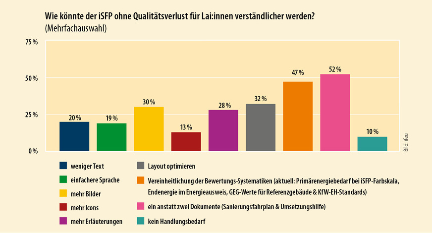 Außerdem wurde gefragt, wie der iSFP für Lai:innen verständlicher werden könnte. Als überraschendes Ergebnis spricht sich eine knappe Mehrheit der Befragten für eine Zusammenführung von Sanierungsfahrplan und Umsetzungshilfe zu Einem aus. Außerdem befürworten 47 Prozent eine Vereinheitlichung der Anforderungssystematiken; also derjenigen Parameter, anhand derer ein Gebäude energetisch bewertet wird. Im iSFP sind das aktuell vor allem der Primärenergiebedarf und der spezifische Transmissionswärmeverlust; im Energieausweis werden die Effizienzklassen hingegen über den Endenergiebedarf definiert. Dieses Thema geht jedoch weit über den iSFP hinaus.