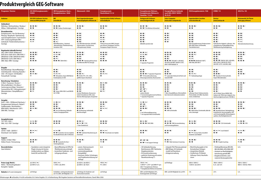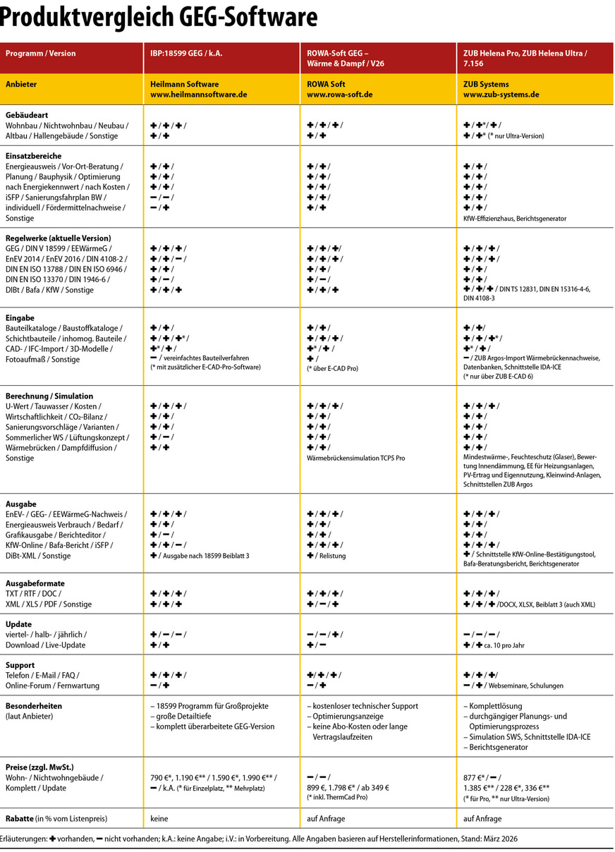 Etwa ein Dutzend kommerziell vertriebene GEG-Programme werden hierzulande offeriert und in der Übersicht tabellarisch vorgestellt. Alle Programme lassen sich sowohl für Neubauten als auch im Bestand, entweder für Wohn- oder Nichtwohngebäude oder beides einsetzen. Den Großteil des Angebots machen auf dem Betriebssystem Windows basierende, konventionelle Desktop-Programme von Herstellern aus, die sich auf Bauphysik oder Gebäudeenergie spezialisiert haben.