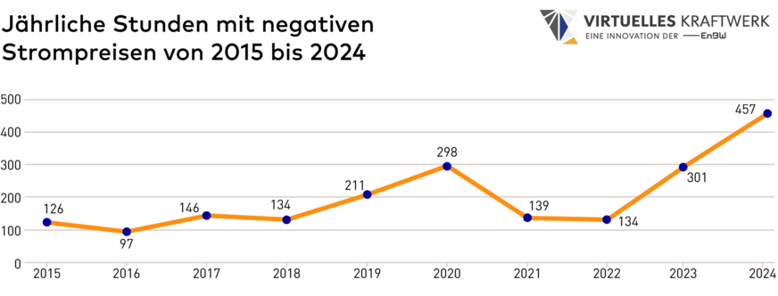 Vor allem im Sommer kommt es an sonnigen Tagen - wenn in ganz Deutschland PV-Anlagen viel Strom ins Netz einspeisen - vermehrt zu negativen Strompreisen, wie in der nachfolgenden Entwicklung der negativen Strompreise von 2015 bis 2024 dargestellt.