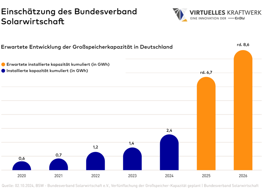 Die steigende Nachfrage nach Flexibilität und somit die wachsende Bedeutung von Batteriespeichern sind deshalb offensichtlich. Kein Wunder, dass auf dem Batteriespeichermarkt von einer “Goldgräberstimmung” die Rede ist. Im Jahr 2024 gab es 457 Stunden mit negativen Strompreisen, ein deutlicher Anstieg im Vergleich zu 301 Stunden mit negativen Strompreisen im Jahr 2023. Diese Entwicklung zeigt, dass der Batteriespeichermarkt enormes Wachstumspotenzial hat, da die Volatilität weiter zunehmen wird. Batteriespeicher erwirtschaften ihre Erlöse in den Preisspannen durch maximale Preishöhen und -tiefen, indem sie bei negativen Strompreisen aus dem Netz laden und dafür Geld erhalten. Dieses Geschäftsmodell treibt die Nachfrage nach Speicherkapazitäten und flexiblen Lösungen an. Laut dem Bundesverband Solarwirtschaft wird eine Verfünffachung der installierten Kapazität großer Batteriespeicher in Deutschland erwartet, wie die nachfolgende Grafik verdeutlicht.