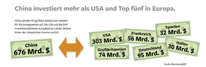 Mit deutlichem Abstand investierte China auch 2023 am meisten. Auch wenn das Wachstum im vergangenen Jahr eher moderat war, macht China mit 676 Milliarden Dollar 38 Prozent des globalen Volumens aus. Die USA schafften es, die Lücke zu verringern, was als Effekt des Inflation Reduction Act bewertet wird. Deutschland steht weiterhin auf Platz drei. Die Elektrifizierung des Verkehrs ist hierbei der größte Investitionstreiber. Mit Deutschland sind insgesamt fünf europäische Länder in den Top Ten. Die Mitgliedsländer der EU erreichen zusammen mit Großbritannien einen Wert von über 400 Milliarden Dollar. Damit investierten 2023 die USA, die EU und Großbritannien zusammen mehr in die Energiewende als China. Das war 2022 nicht der Fall. Außerdem in die Top Ten geschafft haben es Brasilien, Japan und Indien, die alle mehr als 30 Milliarden Dollar aufwandten. Außerhalb der Top Ten und der EU-Staaten schaffte es der Rest der Welt, rund 260 Milliarden Dollar aufzubringen.