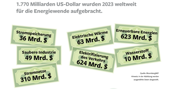 Zu den 1,77 Billionen Dollar Investitionen in die Energiewende kamen 2023 zudem noch 135 Milliarden Dollar für saubere Lieferketten und 84 Milliarden Dollar, die für Klimatechnik aufgebracht wurden. Fabian Kauschke