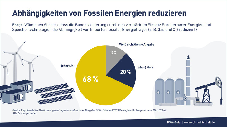 78 Prozent der Bevölkerung empfinden die starke Abhängigkeit Deutschlands von Energieimporten als bedrohlich. 68 Prozent der Wahlberechtigten wünschen sich, dass die Bundesregierung diese Abhängigkeit mit Hilfe erneuerbarer Energien und Speicher reduziert. Das geht aus einer Ende März durchgeführten Yougov-Befragung im Auftrag des Bundesverbandes Solarwirtschaft (BSW) hervor.