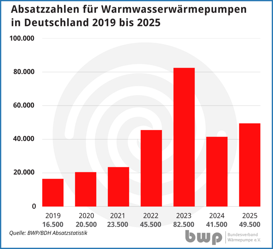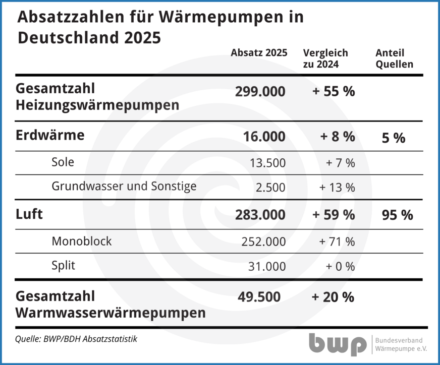 Erstmals sind knapp die Hälfte aller von den Herstellern für die Installation in Deutschland ausgelieferten („abgesetzten“) Wärmeerzeuger Wärmepumpen. Insgesamt waren es 299.000 Stück und zusätzlich 49.500 Trinkwasser-Wärmepumpen. Beim Blick auf die verschiedenen Typen blieben Luft/Wasser-Wärmepumpen mit 95 % Marktanteil weiter das dominierende System (Zuwachs beim Absatz um 59 %). Erdreich-Wärmepumpen hatten 2025 mit 16.000 Geräten einen Marktanteil von nur 5 % und einen Zuwachs von 8 %. Bei den Trinkwasser-Wärmpumpen stieg der Absatz gegenüber dem Vorjahr um 20 %.