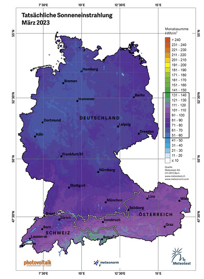 Im Internet finden Sie den aktuellen Einstrahlungsatlas des gerade abgelaufenen Monats als PDF-Datei zum Download. Außerdem hat unser Partner Meteotest aus Bern für Sie eine interaktive Karte programmiert. Darin finden Sie für jeden Standort in Deutschland, Österreich und der Schweiz die Einstrahlungsdaten als Datensatz, ebenso eine Zeitreihe zurückliegender Monate. Gehen Sie einfach mit Ihrer Abokennung auf unsere Website. Den Service finden Sie im Webartikel 1263.