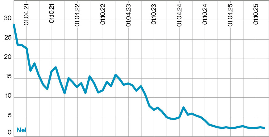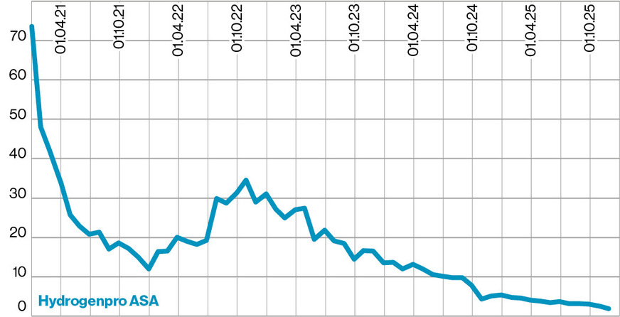 Hydrogenpro ASA Ein alkalischer Hochdruckelektrolyseur ist das Hauptprodukt des auf Wasserstoff und erneuerbare Energien spezialisierten Unternehmens. Hauptaktionäre sind die österreichische Andritz AG und Mitsubishi Heavy Industries aus Japan. Im Jahr 2024 lag der Verlust mit rund 196 Millionen NOK genauso hoch wie der Umsatz, der ein Jahr zuvor noch bei 568 Millionen NOK lag. In den ersten drei Quartalen des Jahres 2025 fiel der Umsatz um 44 Prozent auf rund 70,1 Millionen NOK, während der Verlust für die Aktionäre um 27 Prozent auf rund 194 Millionen NOK stieg.