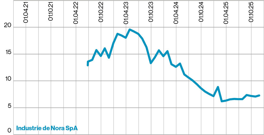 Industrie De Nora SpA Das im Jahr 1923 gegründete und seit 2022 börsennotierte Mailänder Unternehmen zählt zu den Weltmarktführern im Bereich der Elektrochemie. Zur Produktpalette gehören unter anderem Komponenten für die Wasserelektrolyse sowie Elektroden und Beschichtungen für verschiedene Branchen, beispielsweise die Chlorchemie, aber auch Elektronikkomponenten, Wasserfilter und Desinfektionstechnologien. Industrie De Nora ist nach dem Thyssenkrupp-Konzern der zweitgrößte Aktionär der Thyssenkrupp Nucera AG & Co. KGaA. Im Jahr 2024 wurde bei einem Umsatz von 863 Mio. Euro (+1 Prozent) ein Gewinn von 83,4 Mio. Euro (-64 Prozent) erzielt. In den ersten neun Monaten des Jahres 2025 stieg der Umsatz um 5 Prozent auf rund 631 Mio. Euro, der Gewinn um 15 Prozent auf rund 60 Mio. Euro.