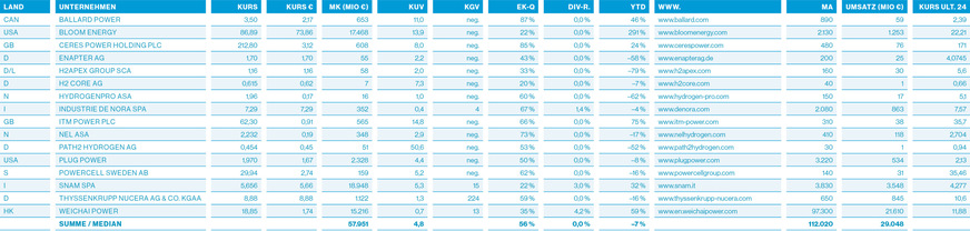Die 16 in der Kennzahlen-Tabelle aufgelisteten Unternehmen aus Europa, den USA und Asien kamen mit zusammen rund 112.000 Beschäftigten zuletzt auf einen Jahresumsatz von rund 29 Mrd. Euro und einen Börsenwert von rund 58 Mrd. Euro. Nur vier dieser Unternehmen schreiben schwarze Zahlen, wobei die chinesische Weichai Power den mit Abstand höchsten Anteil sowohl des Umsatzes (rund 74%) als auch der Beschäftigten (rund 87%) aufweist. Bei der Spalte „KUV“ (Kurs/Umsatz-Verhältnis) stehen in der Tabelle bei acht der 16 Unternehmen Zahlen von fünf bis 50, d. h. der Börsenwert ist damit fünf- bis 50-fach höher als der letzte Jahresumsatz. Ein Aktie erscheint aber in der Regel um so attraktiver, je niedriger das KUV ist. Bei später steigenden Jahresumsätzen erhöhen sich meist auch die Ergebnisse und damit die Kurse. Es folgen – in alphabetischer Reihenfolge – Details zu mehr oder weniger wichtigen Wasserstoff-Aktien.