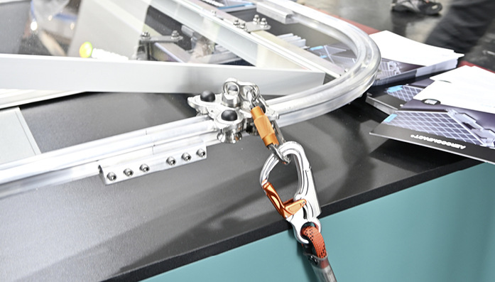 Jeweils in den Eckbereichen läuft das Stahlseil durch Kurvenelemente mit einem Biegeradius von 90 bis 135 Grad. Dies ermöglicht es dem Handwerker, auch um die Ecken der Anlage zu laufen, ohne dass er sich aus- und an anderer Stelle wieder einhängen muss.