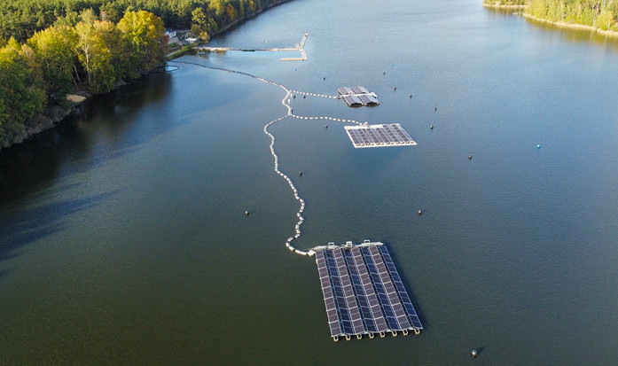 Auf dem Gewässer in Lohsa wurden 190 schwimmende Solarmodule installiert. Der See ist ein Restloch des Kohlebergbaus in der Lausitz. Der Energiekonzern RWE, das Fraunhofer-Institut für Solare Energiesysteme und die Universität Cottbus wollen untersuchen, ob schwimmende Anlagen im Einklang mit der Gewässerökologie betrieben werden können.
