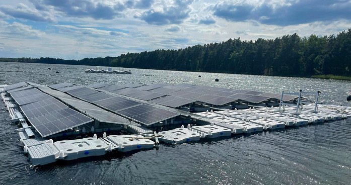 Schwimmende Anlage auf dem Mortkasee in der Lausitz installiert