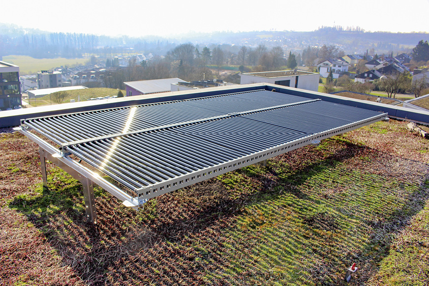 Dieses System hat gleich zwei Vorteile. Einerseits ist die Sonneneinstrahlung auf die Zellen länger als bei flächigen Modulen. Dadurch verteilt sich die Solarstromproduktion gleichmäßiger über den Tag hinweg. Andererseits ist die Statik für die Unterkonstruktion nicht so aufwendig, da die Röhren weniger Windangriffsfläche bieten, zumal sie senkrecht über der Gründachfläche installiert werden.