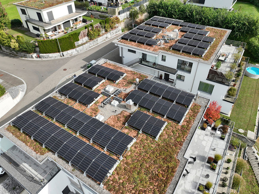 Mit Blick auf die Doppelnutzung der Dachfläche für die Begrünung und die Produktion von Solarstrom können diese technischen Lösungen in zwei Gruppen eingeteilt werden. Einerseits geht es darum, im Neubau und im Bestand die Gründächer gleich mit der Photovoltaik zu kombinieren. Solche Konstruktionen haben die großen Gründachanbieter wie Zinco mit dem System Vert, Bauder mit dem Solar Extensiv oder Contec mit seinem System Energiegründach im Portfolio.