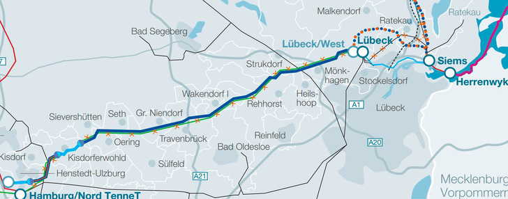 Von Ulzburg bis Stockelsdorf hat Netzkonzern Tennet alle 115 Masten der 380-Kilovolt-Ostküstenleitung (Betrieb ab 2027) für Windstromimporte aus Ostholstein in die Metropole Hamburg errichtet. Im Bau ist noch die 50-Kilometer-Trasse nach Norden, die den Windstrom sammelt. (tw)