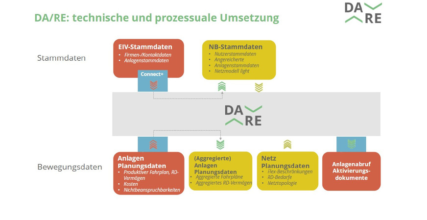 Die Prognosedaten und Fahrpläne werden dabei entweder durch die Anschlussnetzbetreiber selbst oder durch die Einsatzverantwortlichen erstellt und gemeldet. In der aktuellen Praxis sind diese Prozesse aber noch vielfach fehlerhaft oder nur ungenügend umgesetzt, sodass die Bundesnetzagentur (BNetzA) in ihrem Eckpunktepapier eine deutliche Verbesserung durch einen weitergehenden Testbetrieb angemahnt hat. Die eigentlichen DA/RE-Prozesse (blau eingefärbt) stellen sicher, dass alle relevanten Netzbetreiber die benötigten Daten weitergeleitet bekommen. Zur Kommunikation mit den Einsatzverantwortlichen ist die Plattform technisch zudem an Connect+ angebunden.