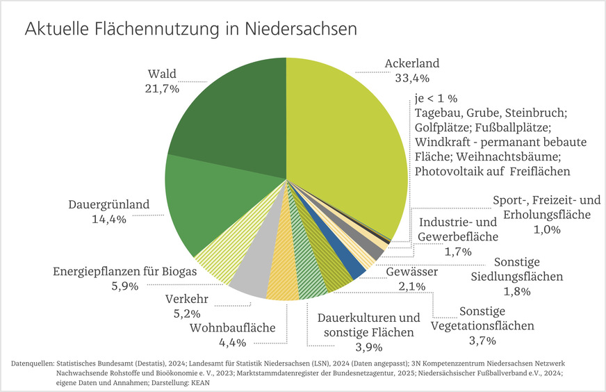 Alternativ hat die KEAN die Flächencluster auch als Torte dargestellt. „Die geringen Flächenbedarfe von Wind- und Solarenergie würden in dieser Darstellung allerdings untergehen“, so die Klimaschutzagentur. Anders ausgedrückt: „Wäre Niedersachsen eine Torte, wären die Flächenanteile für Windenergie- und Freiflächen-PV-Anlagen kaum sichtbare Krümel.“