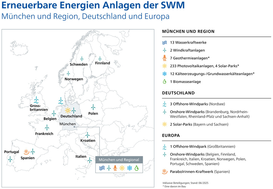 Grundsätzlich sei es Ziel der Ausbauoffensive, so viel Ökostrom wie möglich lokal und regional zu produzieren, heißt es in einer Presseinformation. Da aber der Wind auf dem Meer deutlich kräftiger und konstanter wehe als in der Landeshauptstadt und die Sonne in Südeuropa intensiver scheine als hier, hätten sich die SWM dort in Europa, wo die entsprechenden Potenziale und Gegebenheiten vorhanden seien, hieß es zur Begründung. Bemühungen der SWM, den Erneuerbaren-Ausbau auch in und um München voranzubringen, hätten in den vergangenen Jahren oftmals politische Vorgaben in Bayern entgegengestanden. „Lokal und regional haben wir umgesetzt, was bis dato bei den geltenden Rahmenbedingungen machbar war – zuletzt deutlich mehr“, betonte Dr. Florian Bieberbach.