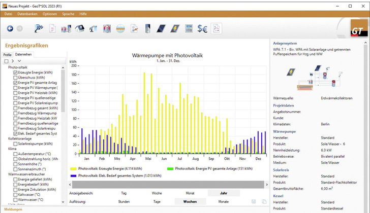 Geo T Sol von Valentin Software ist ein professionelles Werkzeug für die Planung und Auslegung von Wärmepumpenanlagen. Das Programm bietet für einen beliebigen Standort die Wahl zwischen verschiedenen Wärmequellen, Betriebsweisen und zahlreichen Anlagenkonfigurationen. Auf Grundlage einer dynamischen Minutensimulation können Stromverbrauch, Jahresarbeitszahlen und Betriebskosten unter Berücksichtigung von Sperrzeiten und Tarifen berechnet werden.