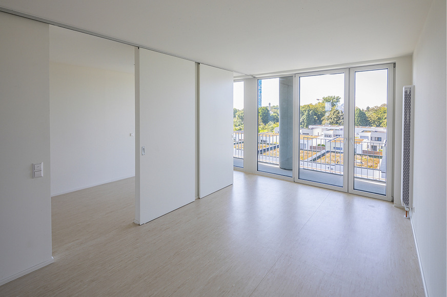 Kostensparende Effekte ergaben sich zudem aus dem Verzicht auf einen Keller und die offene Erschließung über Laubengänge mit außenliegenden Treppenläufen. Die nötigen Stauräume sind in die Wohnungen integriert, wofür die Bewohner quasi sechs Quadratmeter mietfrei erhalten. Wer kein Jäger und Sammler ist, kann den fensterlosen Abstellraum in der Mitte der Wohnungen natürlich auch anderweitig nutzen, beispielsweise als Mini-Arbeitsplatz, Hobby- und Bastelecke oder als Sauna. Überhaupt bieten die Wohnungen dank Schiebetüren anstatt fester Trennwand gewisse kreative Freiräume für die Art des Wohnens, die insbesondere bei den schmalen 2-Zimmer-Wohnungen sprichwörtlich den Horizont erweitern.