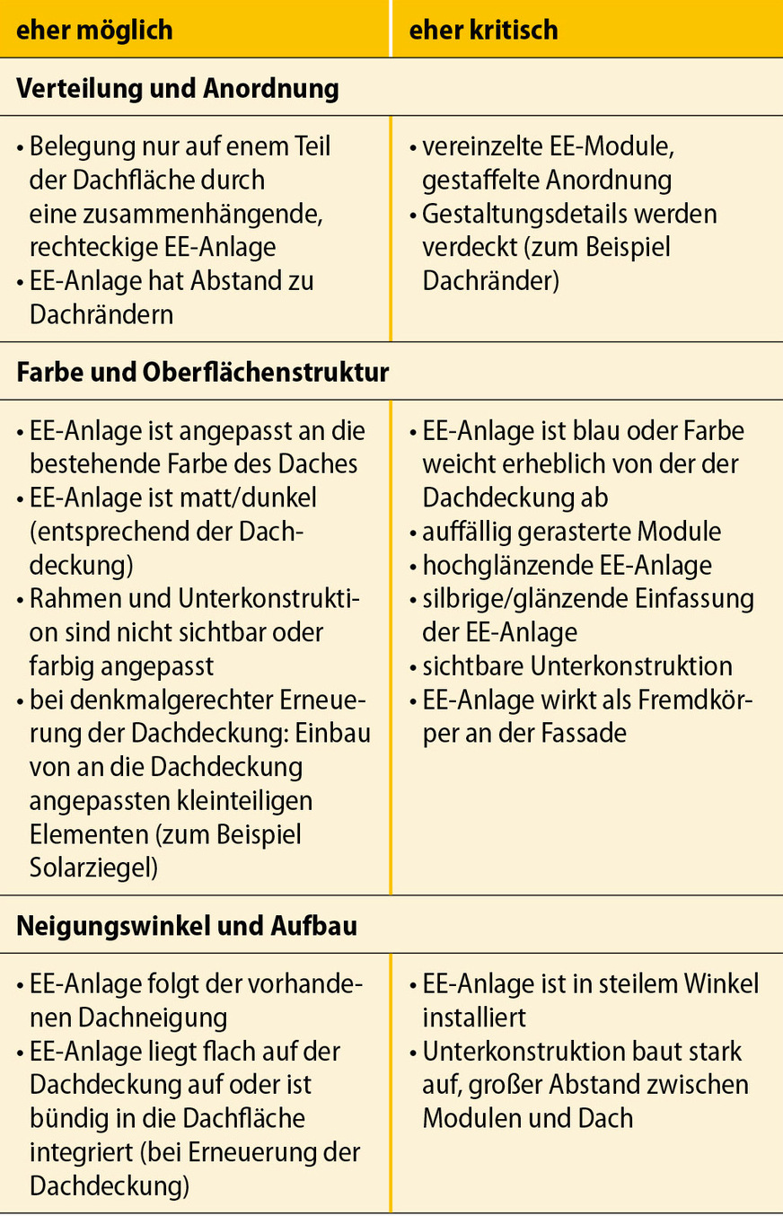 Für den Fall einer nachträglich installierten Solaranlage wird beispielsweise unterschieden, ob die Module der Anlage farblich zur Dacheindeckung oder der Fassade passen und ob Rahmen und Unterkonstruktion verdeckt beziehungsweise nicht sichtbar sind. Entsteht der Eindruck eines Fremdkörpers am Denkmal oder fügt sich das neu hinzugekommene Bauteil optisch gut ein? Liegt die Solaranlage flach auf der Dachdeckung auf beziehungsweise wird sie bündig in die Dachfläche integriert oder handelt es sich um eine mit steilem Winkel aufgerichtete, gut einsehbare Anlage?