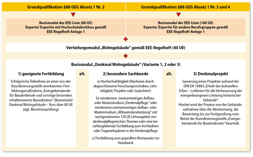 Für Wohngebäude Denkmal ist der Basiskurs über 80 Unterrichtseinheiten (UE) zu absolvieren, für den Eintrag in der Kategorie Nichtwohngebäude Denkmal zusätzlich das Vertiefungsmodul mit 32 UE. Nach wie vor gibt es die Möglichkeit, die Fortbildung Baudenkmal durch besondere Sachkunde zu ersetzen. Anerkannt sind