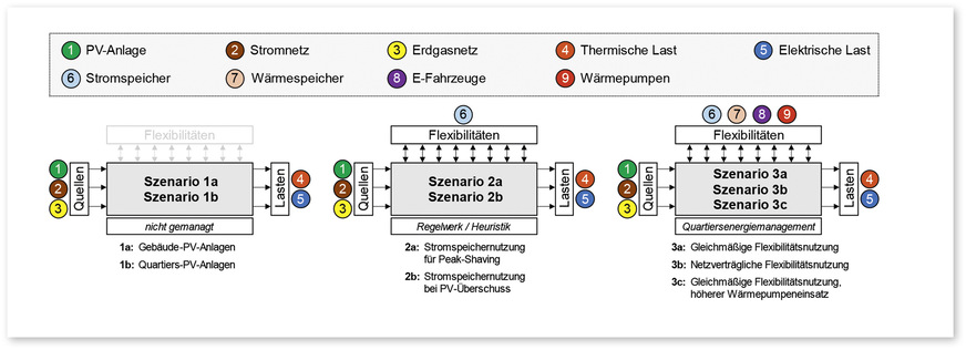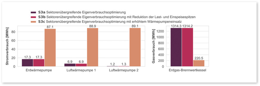 In den Szenarien 3a bis 3c schließlich wurde nicht nur über die Gebäude-, sondern auch über die Sektorengrenzen hinweg geteilt, unter Einbeziehung steuerbarer Anlagen und Lasten, der Wärmepumpen, des thermischen Speichers und der Ladepunkte für die Elektrofahrzeuge, sowie unter der Annahme eines Energiemanagementsystems. Während in 3a die gleichmäßige Nutzung der vorhandenen Flexibilitäten Vorgabe war, sollte in Szenario 3b das öffentliche Netz soweit wie möglich vor Last- und Einspeisespitzen bewahrt werden. In 3c schließlich sollten die Wärmepumpen Vorrang bei der Wärmeerzeugung haben, die Gaskessel so sparsam wie möglich eingesetzt werden.
