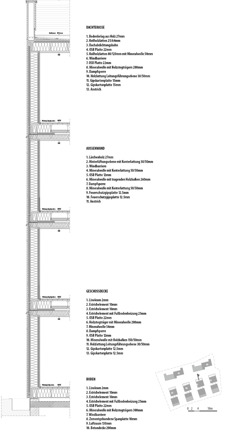 Die Gebäude sind durch die Holzrahmenbauweise zudem sehr leicht konzipiert, sodass der Materialaufwand im Vergleich zu einer konventionellen Bauweise um 75 Prozent reduziert werden konnte. Jedes der Häuser wiegt nur ein Sechstel eines konventionellen Massivhauses mit Putzfassade, sodass beim Bau allein in den Untergeschossen 5500 Kubikmeter Beton und 1800 Tonnen CO2 gespart werden konnten. Die CO2-Einsparung wird gerade über einen Gebäuderessourcenpass ermittelt.