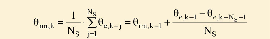 In den Schweizer Normen wird daher ein 48-stündiger Mittelwert angesetzt. Eine zu diesen Normen etwas abgewandelte Formel, in die nur zurückliegende Stundenmittelwerte eingehen und nicht der aktuelle, entspricht Gleichung 4. Wie der rechte Teil dieser Gleichung zeigt, ist eine rekursive Berechnung des gleitenden Stundenmittelwerts möglich, was die Programmierung vereinfacht.