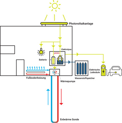 Südlich von Bonn hat die G Josef Küpper Söhne GmbH mit ihrem nun dritten Firmenstandort Meckenheim ein nigelnagelneues Badstudio eröffnet, in dem sich frisch gebackene Baufrauen und Bauherren auf 450 Quadratmeter Ideen für ihren noch in Planung oder im Rohbau befindlichen Wellnesstempel holen können. Meistens reicht’s am Ende dann doch nur für ein ordentlich gestaltetes Bad, zumal das Baubudget für ein effizientes energetisches Konzept in jedem Fall besser als für Dusch-WCs oder Whirlpools angelegt ist. Die Küppers – die ihr Unternehmen seit 1919 immerhin nun schon in vierter Generation führen – machen’s selbst vor: Sie haben mit dem neuen Firmengebäude die nach eigenen Aussagen bundesweit erste Gewerbeimmobilie auf die Wiese gesetzt, die sich völlig autark dank am Gebäude produzierten, grünen Wasserstoff mit Wärme, Kälte und Strom versorgt. Die Komponenten sind schnell aufgezählt: PV-Module auf dem Flachdach und an den Fassaden erbringen 98 kWp Leistung und füttern mit dem Solarstrom die Picea-Energiezentrale, die den Gleichstrom in Wechselstrom für Beleuchtung, die IT-Infrastruktur sowie alle weiteren elektrischen Geräte umwandelt. Auch die Batterien der elektrisch angetriebenen Firmenflotte werden mitversorgt – insgesamt zehn Ladesäulen sind dafür installiert. Nicht zu vergessen die an zwei 130 m tiefe Erdsonden angeschlossene Wärmepumpe mit 17,5 kW Heizleistung, die auch von Picea versorgt wird, um über die Fußbodenheizung sommers wie winters (siehe Grafiken) das Klima im Schauraum und in den Büros im angenehmen Temperaturbereich zu halten. Der in der Regel im Sommer anfallende Solarstromüberschuss wird in einer 125 kW fassenden Batterie gespeichert, mittels Elektrolyse in Wasserstoff umgewandelt und für den Winter in dem 440 kg H2 fassenden Speicher gebunkert (ergibt 7500 kWh elektrische Energie / 7500 kWh Wärmeenergie). In den trüben und dunklen Wintermonaten versorgt dann die Brennstoffzelle das Gebäude mit Strom, der aus dem vorjährig gewonnenen und elektrolysierten Solarstromüberschuss stammt. Die Abwärme aus den Prozessschritten Elektrolyse und Wasserstoffeinlagerung sowie der Brennstoffzelle selbst wird im Winter zur Beheizung und Brauchwassererwärmung genutzt. Wirklich clevere Bau-