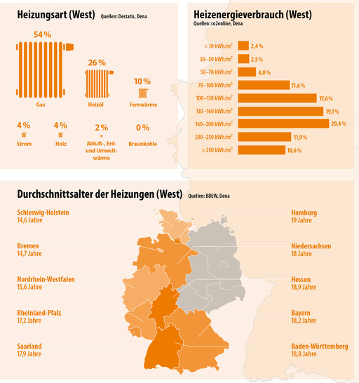 Was das Alter der eingebauten Heizungsanlagen angeht, ist ebenfalls kein bestimmtes Muster zu erkennen. Ob in Ostdeutschland mit durchschnittlich 17 Jahren oder in Westdeutschland mit durchschnittlich 17,4 Jahren – die meisten von ihnen laufen schon recht lange und gehören in den kommenden Jahren ausgetauscht. Dann hoffentlich gegen eine klimafreundliche Alternative. Damit die fossilen Energieträger nicht weiterhin das Geschehen in den Heizungskellern bestimmen. jb