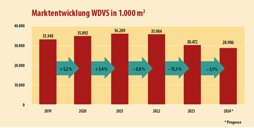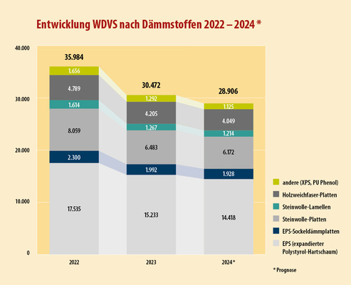 Im April stellte der Verband für Dämmsysteme, Putz und Mörtel (VDPM) seine Zahlen für 2023 vor und die waren alarmierend: Der Absatz von Wärmedämmverbundsystemen (WDVS) hatte sich von 2022 auf 2023 um 15,3 Prozent verringert. VDPM-Hauptgeschäftsführer Lars Jope sprach von einem historischen Einbruch, zumal das Minus von 2021 auf 2022 nur 0,8 Prozent betragen hatte. Neu an dieser Entwicklung sei außerdem, dass neben der Bautätigkeit auch die Modernisierungen betroffen seien. Kontinuität gibt es insofern, als EPS weiterhin am beliebtesten ist, betrachtet man die Absatzzahlen der einzelnen WDVS-Dämmstoffe von 2022 und 2023, inklusive der Prognose für 2024. Die Fachwelt sieht das gute Preis-Leistungs-Verhältnis als einen Grund.