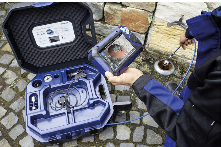Mit einer Inspektionskamera lassen sich Beschädigungen an schwer oder nicht zugänglichen Stellen finden, zum Beispiel in Kanälen, Rohren oder Schornsteinen. Dazu ist eine kleine Kamera an einer mobilen Sonde befestigt. So wie bei der VIS 500 von Wöhler. Bei ihr lassen sich die Kameraköpfe sogar auswechseln. Wöhler liefert mit seinem Set zwei Stück davon, eine mit einem Durchmesser von 26 mm, die andere mit einem Durchmesser von 40 mm. Die dreh- und schwenkbaren Kameraköpfe können die Nutzer:innen über ein Tastenkreuz steuern, weshalb sich auch Schadstellen beispielsweise an den Seiten eines Rohres ausfindig machen lassen. Bilder und Videos speichert die Inspektionskamera wahlweise in ihrem internen Speicher oder auf einem USB-Stick. Der Strom aus den Lithium-Ionen-Akkus reicht für sechs Stunden. Über eine App lässt sich ein Smartphone oder ein Tablet-PC als zweites Display nutzen. jb