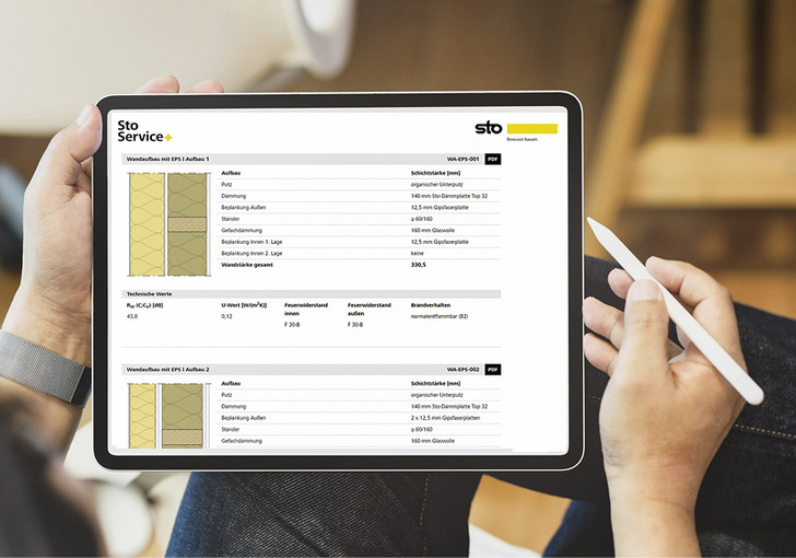 Diese Fragen standen Pate bei der Entwicklung des Wandaufbau-Konfigurators. Das digitale Werkzeug ist frei zugänglich und bietet zwölf variierbare Parameter. Jede Modifikation zeigt, wie sich die Veränderung einer einzelnen Einflussgröße auf die gesamte Wandkonstruktion auswirkt. Will man also beispielsweise prüfen, wie sich bestimmte Brandschutzvorgaben umsetzen lassen, werden die entsprechenden Werte angeklickt. Von Klick zu Klick werden aus einer Auswahl von 40 Wandaufbauten die geeigneten Konstruktionen mit einer Zeichnung (Wandquerschnitt) sowie die notwendigen Baustoffe und ihre Materialstärken angezeigt. Jede Variante kann als PDF heruntergeladen werden, in dem Fußnoten die Quellen aller verwendeten Werte angeben. Bleiben Fragen offen, kann direkt aus der Bildschirmmaske heraus E-Mail-Kontakt mit den Holzbauspezialisten des Technical Support Centers von Sto aufgenommen werden. pgl