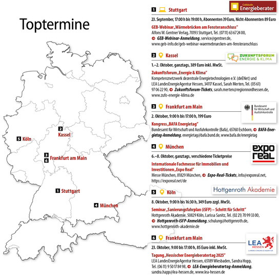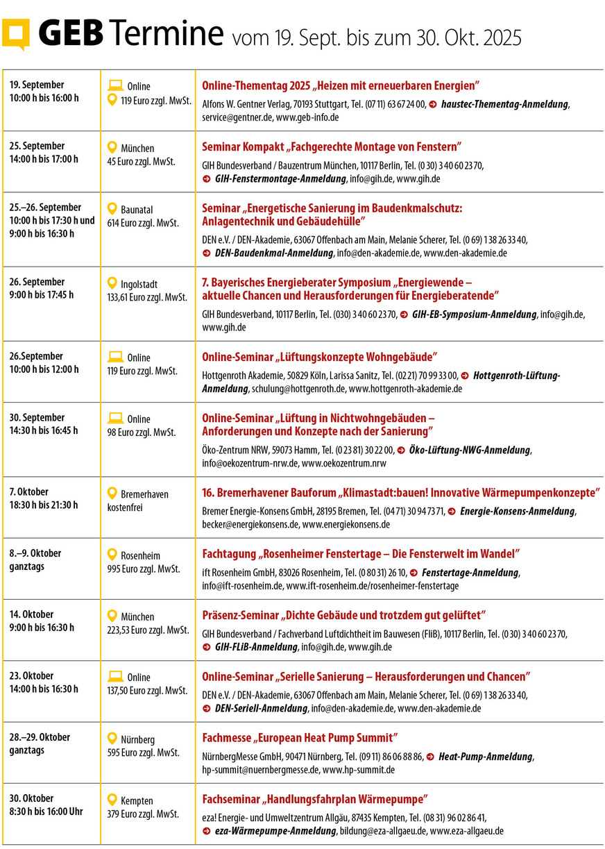 Nach entspannten Urlauben ist nun der Kopf frei für neues Wissen – wir haben Ihnen hierfür wieder viele interessante Seminare und Veranstaltungen zusammengestellt. Vor allem die Toptermine haben es diesmal in sich: Bafa-Energietag in Frankfurt, Expo Real in München und natürlich ein exklusives GEB-Webinar!