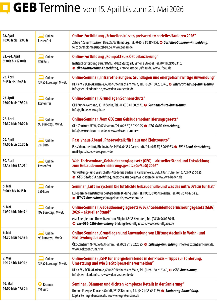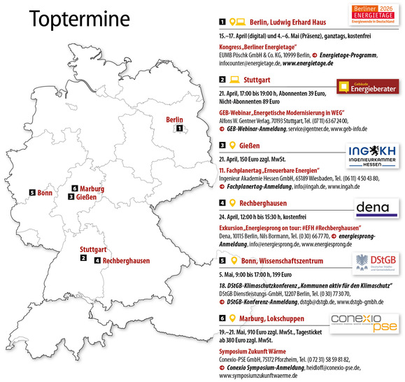 Alle Jahre wieder kommt der Frühling – und mit ihm die Energietage in Berlin, die immer einen Besuch wert sind, zumal die Veranstaltung kostenfrei ist. Zu empfehlen ist auch das GEB-Webinar am 21. April sowie die Energiesprong-Exkursion nach Rechberghausen unweit von Göppingen. Die Termine sind mal wieder pickepacke voll.