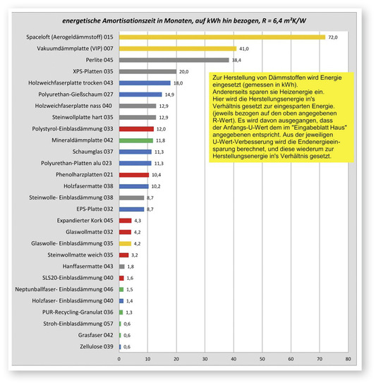 Ein Excel-Tool zur Berechnung R-Wert abhängiger Stoffkennwerte hat das Institut für preisoptimierte energetische Gebäudemodernisierung entwickelt. Mit ihm können Energieberatende berechnen, wie dick ein gewählter Dämmstoff sein muss, um einen gewünschten U-Wert zu erreichen. Dabei können sie aus 28 verschiedenen Dämmstoffen auswählen. Die Palette reicht von der Vakuumdämmung über Polyurethandämmplatten bis zur Strohdämmung. Das Tool errechnet nicht nur die Dämmstoffdicke, sondern unter anderem auch die Materialkosten, welche CO2-Belastung bei der Herstellung entsteht, welche energetische Amortisationszeit sich ergibt und das Verhältnis von eingesparter Energie zur Herstellungsenergie. Die Ergebnisse beziehen sich jeweils auf einen Quadratmeter Dämmstoff. Sie werden als Grafik und Tabelle dargestellt und können, abgestimmt auf die individuelle Situation anhand der priorisierten Kennwerte bei der Wahl des optimalen Dämmstoffes helfen. jb