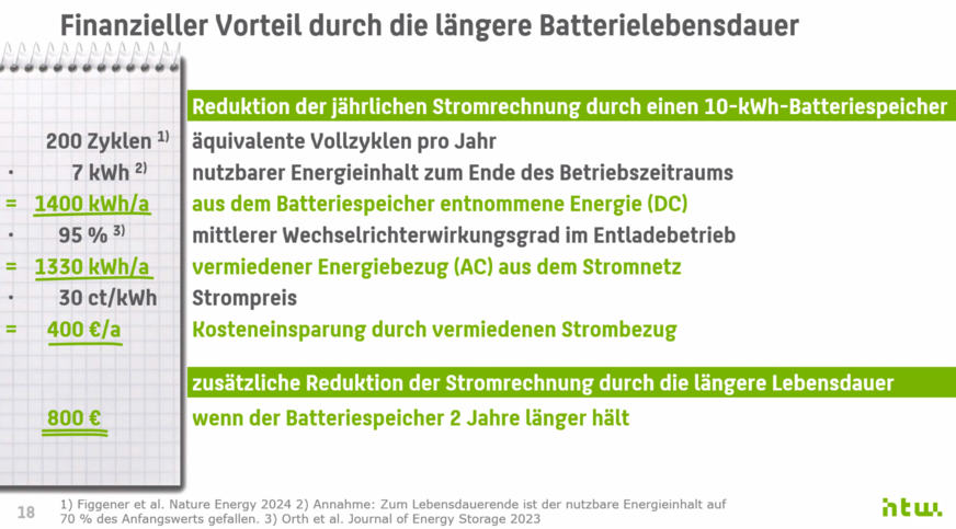 Intelligente Energiemanagementstrategien verzögern die Batterieladung mithilfe von Solarstromprognosen. Das reduziert die Standzeiten bei hohen Ladezuständen, was die Lebensdauer von Lithium-Ionen-Batterien um durchschnittlich zwei Jahre verlängert. Bei einem Heimspeicher mit zehn Kilowattstunden erhöht die zusätzliche Betriebszeit die Kosteneinsparung um mindestens 800 Euro. Das hat die Forschungsgruppe Solarspeichersysteme der HTW Berlin nun ermittelt. Und nicht nur die Betreiber profitieren: „Wenn alle Heimspeicher mittags laden, könnten wir den Bundeshaushalt bereits heute um einen zweistelligen Millionenbetrag entlasten“, weiß Professor Volker Quaschning, Experte für Regenerative Energiesysteme an der HTW Berlin.